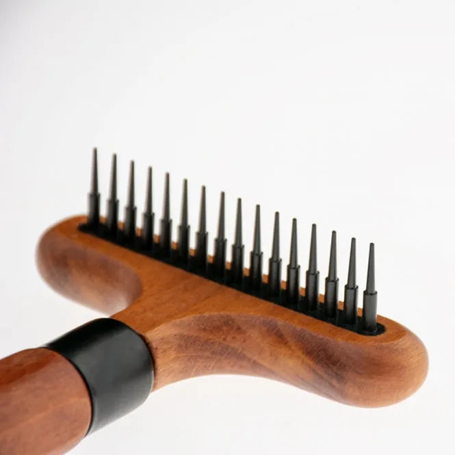 Entwirrungsharke von Noir Japandi mit verzinkten Edelstahlstiften. Schonende und sanfte Anwendung dank der rotierenden, flexiblen und elastischen Zähne. Einreihig mit 16 Stiften für schwer zugängliche Stellen und dichte Unterwolle. Die Bürste hat einen ergonomischen Griff aus FSC-zertifizierter Buche mit dunkel gebeizter Oberfläche. Geeignet für Hunde und Katzen. Empfohlen für die Zeit des Fellwechsels. Anwendung alle 3 Monate.