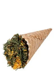 Knusprige Waffeltüte gefüllt mit einer leckeren Kräuter-Blütenmischung. Mit einem Halter zur sicheren Befestigung für einen langen Knabberspaß.