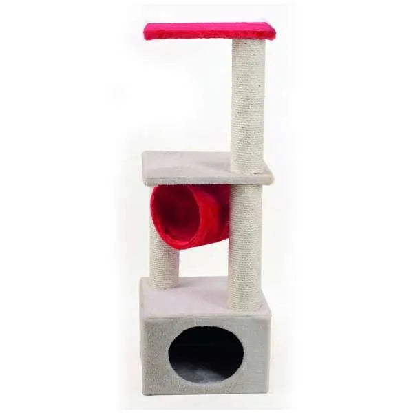 Der Kratzbaum besteht aus einer Höhle, 3 Sisal-Stämmen, zwei Liegeplatten und einer Röhre.
