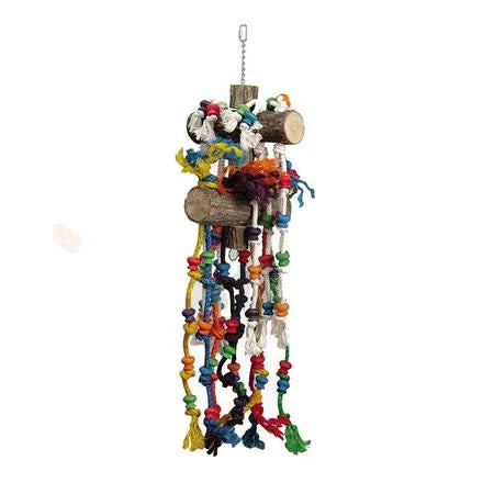 Dieses Papageien-Spielzeug besteht aus verschiedenen Elementen aus buntem Holz, Naturholz mit Rinde und Seil.