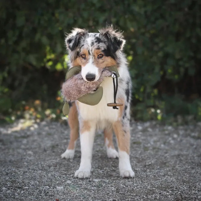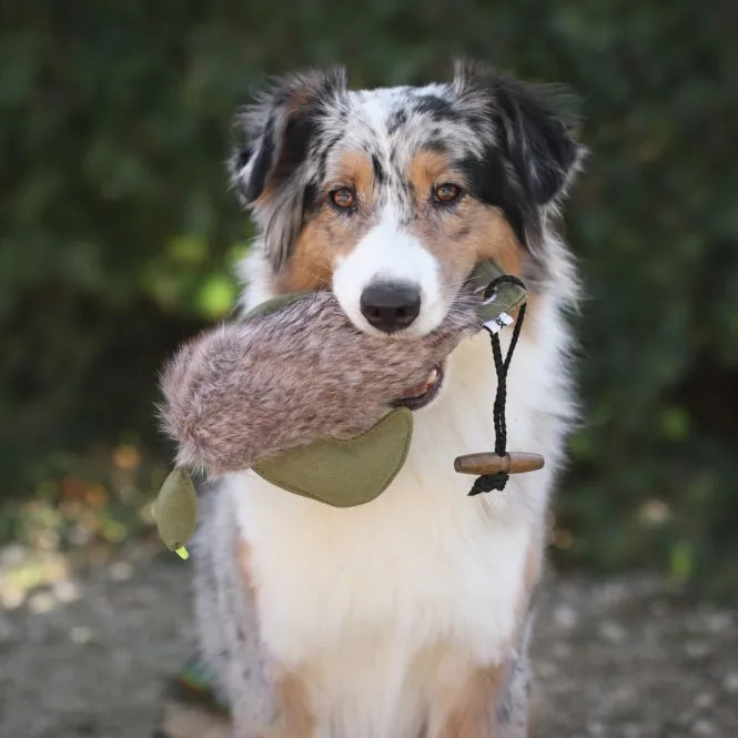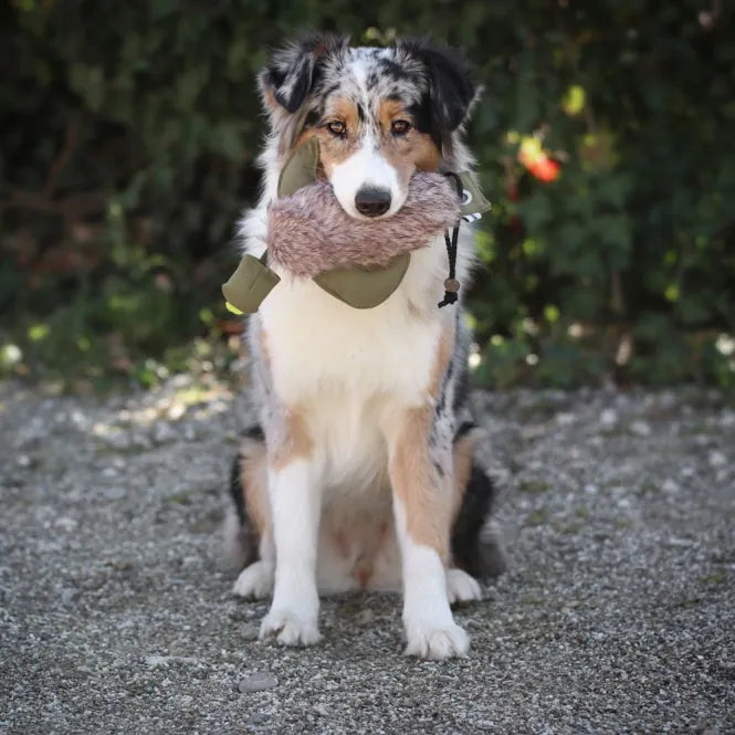 Der Dummy in Entenform lässt sich mithilfe des Wurfbandes besonders gut weit werfen und eignet sich durch seine Schwimmfähigkeit ideal fürs Apportiertraining am Wasser und an Land.