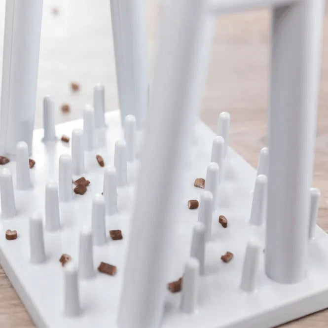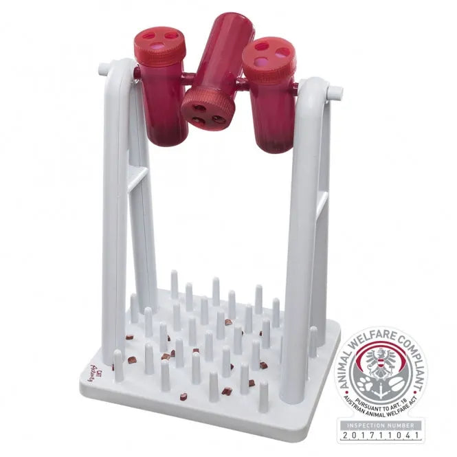 Das Verstecken von Leckerlis in den Bechern wird das Interesse Ihrer Katze wecken. Sie erspäht die Belohnung und versucht sie durch Strategie, Geschicklichkeit und Ausdauer zu erbeuten. Nach einer gewissen Übungszeit gelingt es ihr, die Becher mit ihrer Pfote zu drehen, bis einige Leckerlis auf die Grundplatte mit den Zapfen fallen. Mit ein wenig 'Pfoten-Geschick' kann sie ihre Belohnung dann herauspföteln.