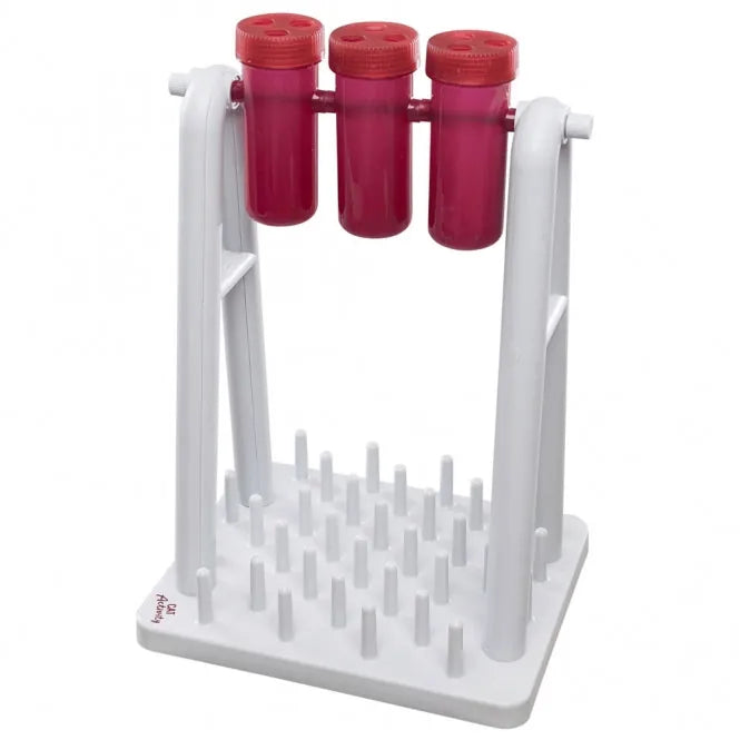 Der Turn Around besteht aus einer Grundplatte mit Zapfen, auf welcher ein Ständer mit drei variablen Bechern befestigt ist. Diese lassen sich unabhängig voneinander drehen und können mit einem Deckel verschlossen werden.