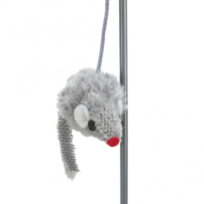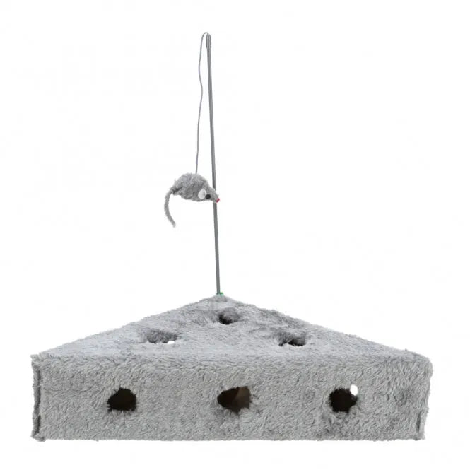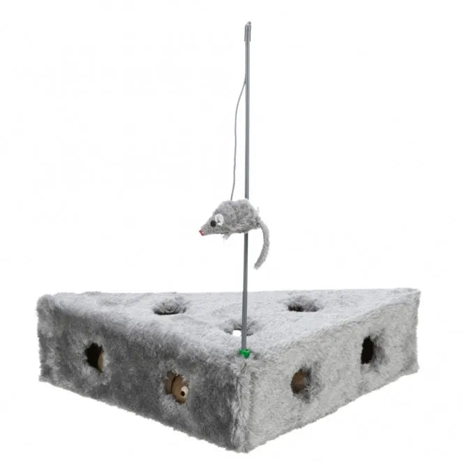 Katzenspielzeug mit Plüschbezug. Ausgestatttet mit einer Plüschmaus an einer Spielangel und drei Spielbällen im Inneren des Cats Cheese.