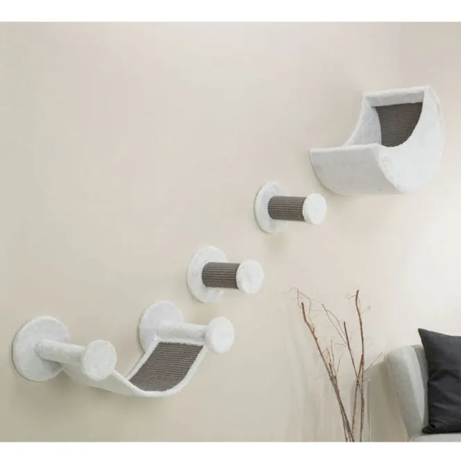 Dieses Wand-Set kann mit anderen Wandelementen kombiniert werden und erweitert den Lebensraum deiner Katze um höher gelegene Bereiche. Die abwechslungsreiche Landschaft erfüllt ihr Bedürfnis nach Aktivität und Bewegung und verwandelt deine Wand in einen Abenteuerparcours zum Erkunden.
