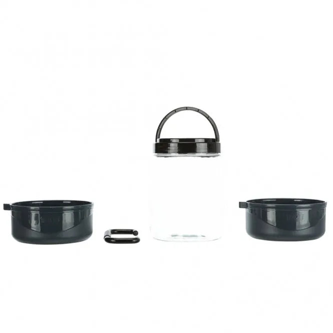 Das Set besteht aus einem Wasser- und einem Futternapf je 0,75 l und einem Futterbehälter mit 2 l Fassungsvermögen zum Aufbewahren des Trockenfutters. Die Einzelteile werden zum Transportieren einfach zusammengesteckt und können so platzsparend verstaut oder mit Hilfe des Griffs getragen werden.