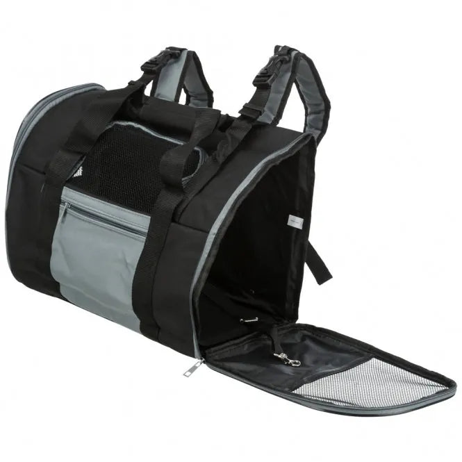 Der Rucksack, der ebenso als Tragetasche genutzt werden kann, besteht aus strapazierfähigem Nylon/Polyester und kann zum Reinigen einfach ausgewischt werden. Eine separate Fronttasche bietet Platz für Kleinigkeiten und Zubehör, eine integrierte Kurzleine verhindert das Herausspringen des Tieres während des Transportes. Der Rucksack lässt sich seitlich und von vorne öffnen und ist mit stufenlos verstellbaren Schultergurten und mehreren Netz-Einsätzen für eine gute Luftzirkulation ausgestattet. Außerdem sind auf der Rückseite Laschen vorhanden, die ein Anschnallen des Rucksacks im Auto ermöglichen. Dadurch dass die Seitenteile sich per Reißverschluss komplett öffnen lassen, kann die Tasche bei Nichtgebrauch platzsparend zusammengelegt werden.