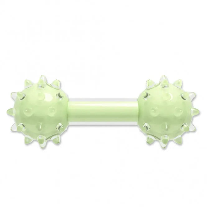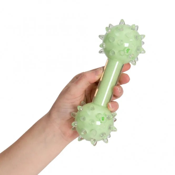 Die Hantel mit Noppen ist grün und duftet nach leckerer Minze. Sie ist ca. 18 cm groß.
